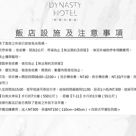 O hotel no bairro North de Tainan fica a 1.5 km do Templo de Tiantan Tiangong e a 1.6 km de locais de compras como Armazéns Hayashi. Museu Black Bridge Sausage está a 10 minutos de carro do o Dynasty Hotel. Os edifícios religiosos notáveis nas proximidades incluem o Templo de Confúcio em Taiwan, a 1.7 km deste alojamento de 3 estrelas. O hotel está localizado a 5 km do aeroporto de Tainan e próximo da paragem Chenggong Road.
